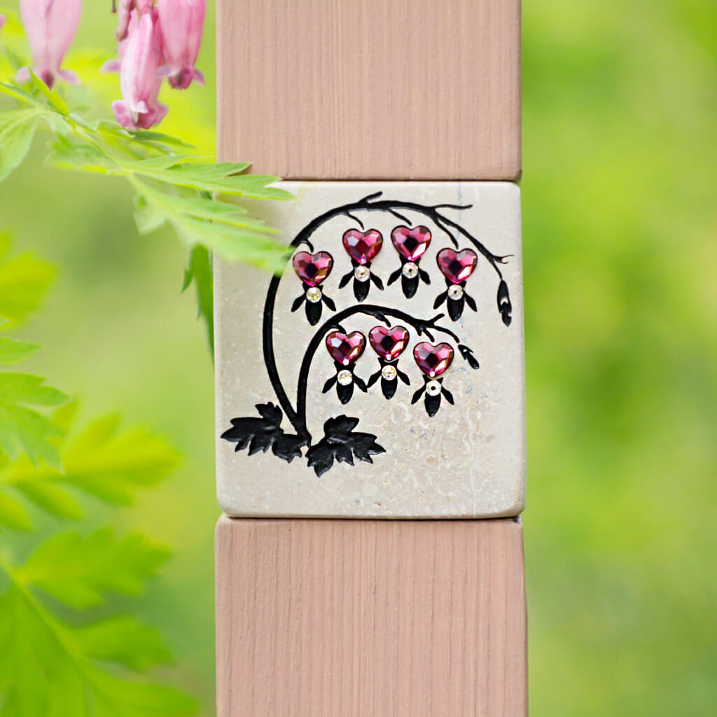 – Tränendes Herz: eine zart gravierte Pflanze mit hängenden Herzblüten – besetzt mit Herzkristallen und einer weißen Träne aus Glas. Dieses Motiv steht für Liebe, Verlust und die tiefe Verbindung zu einem Menschen, der fehlt.